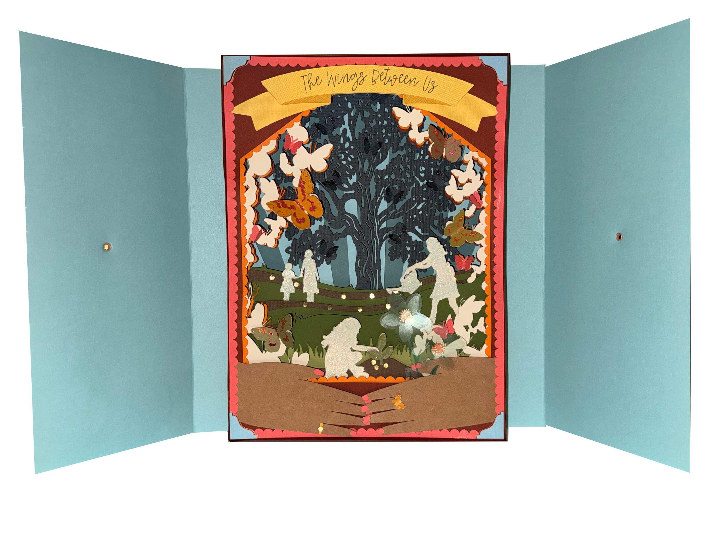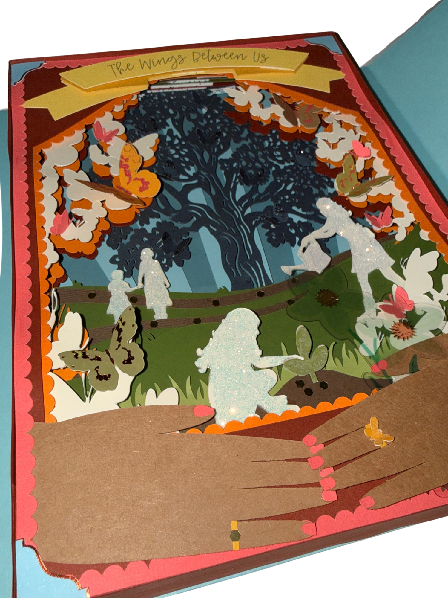 Once each layer was uploaded into Cricut Design Space and I had all of my necessary papers collected, I formatted the files to fit on the papers and began sending them one by one to cut out as well as the banner piece with the title written on by the pen that came with the Cricut Joy Xtra. The following images are what the file looked like on the screen as well as its preview for cutting on the mat. Once cut, I carefully layered each sheet of paper with 1-2 levels of adhesive foam in between to create the amount of depth that I desired in order to give the story more dimension. Once all of the base layers were completely attached to one another, I utilized found scrapbooking materials, glitter, hole punched butterflies, and more. To finish the piece, I covered all the unfinished foam edges with more cardstock and then created an envelope to enclose the entire shadowbox.